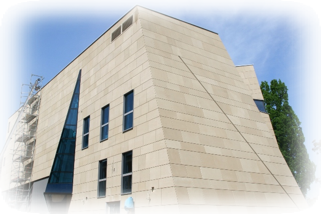 Eine blaue Fensterfuge über der Eingangstreppe symbolisiert den Keil, mit dem der Mensch das Gestein in Blöcke