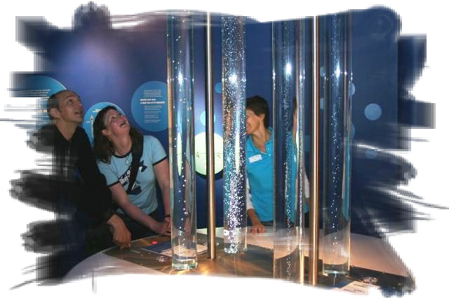 In Plexiglassäulen darf er Mini-Geysire erzeugen, indem er Wasser mit Kohlendioxid nach oben pumpt. "Über"